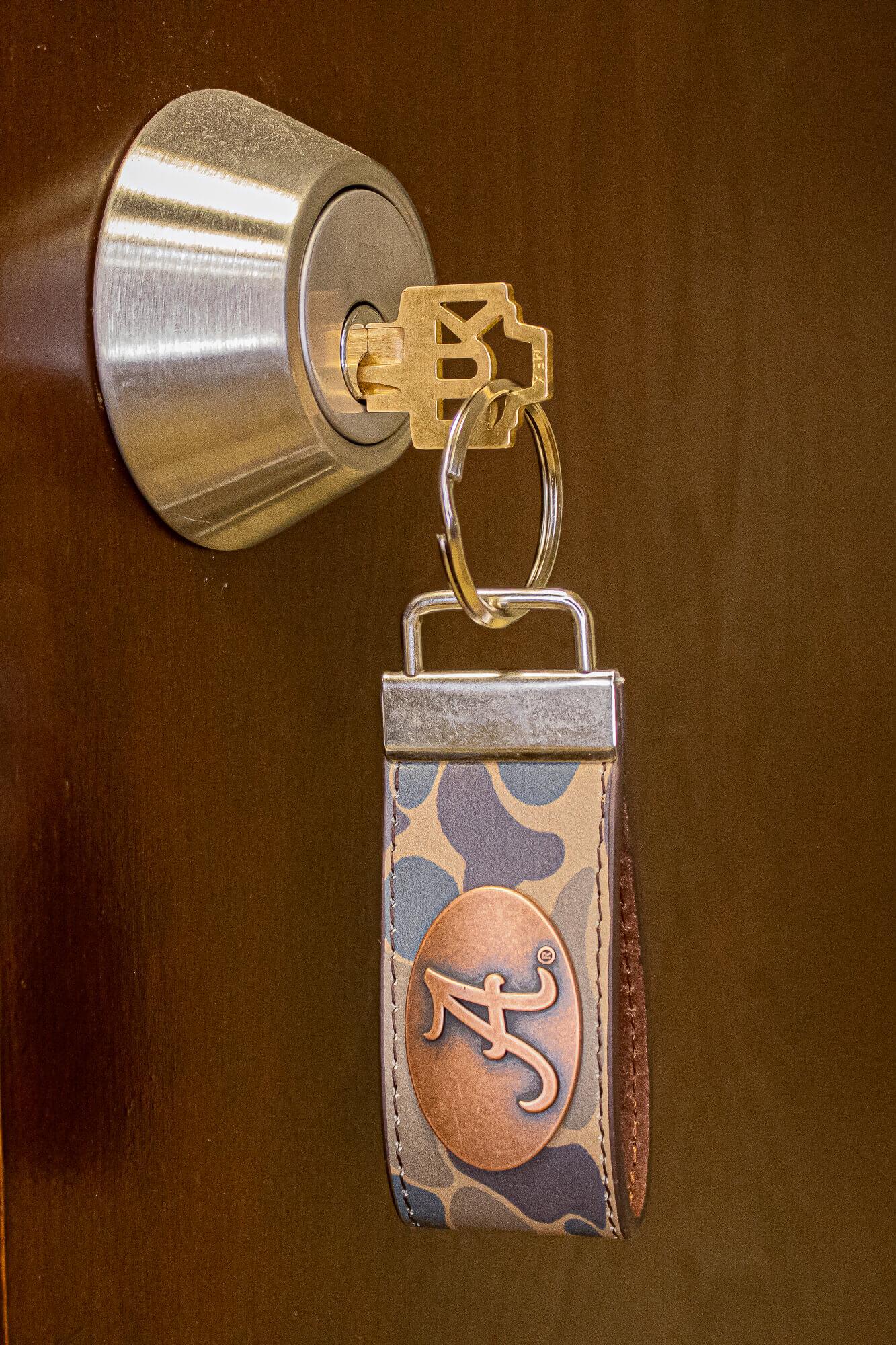 Show your BAMA pride with an original Zep-Pro leather Old School Camo keychain. This accessory is popular among college students and alumni. This key chain is constructed of full grain leather and features an oval logo, proudly displayed on the front of the fob. The metal emblem has an antique copper finish which perfectly accents this accessory.