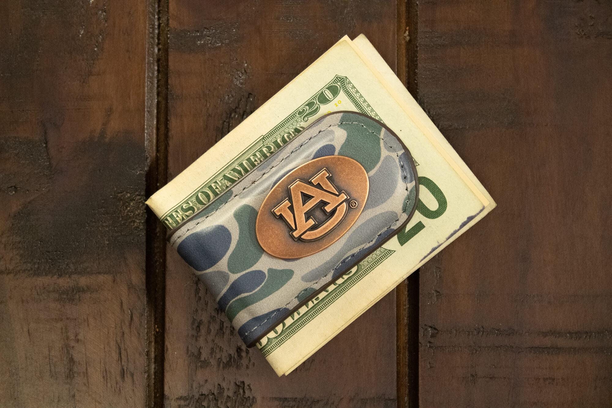 Show your Auburn Tigers pride with an original Zep-Pro Old School Camo leather money clip. It is a stylish and unique way to show enthusiasm while keeping important cards and cash organized. This Zep-Pro wallet is constructed of full grain leather with an Old School Camo print. The metal concho emblem has an antique copper finish which perfectly accents this unique accessory.