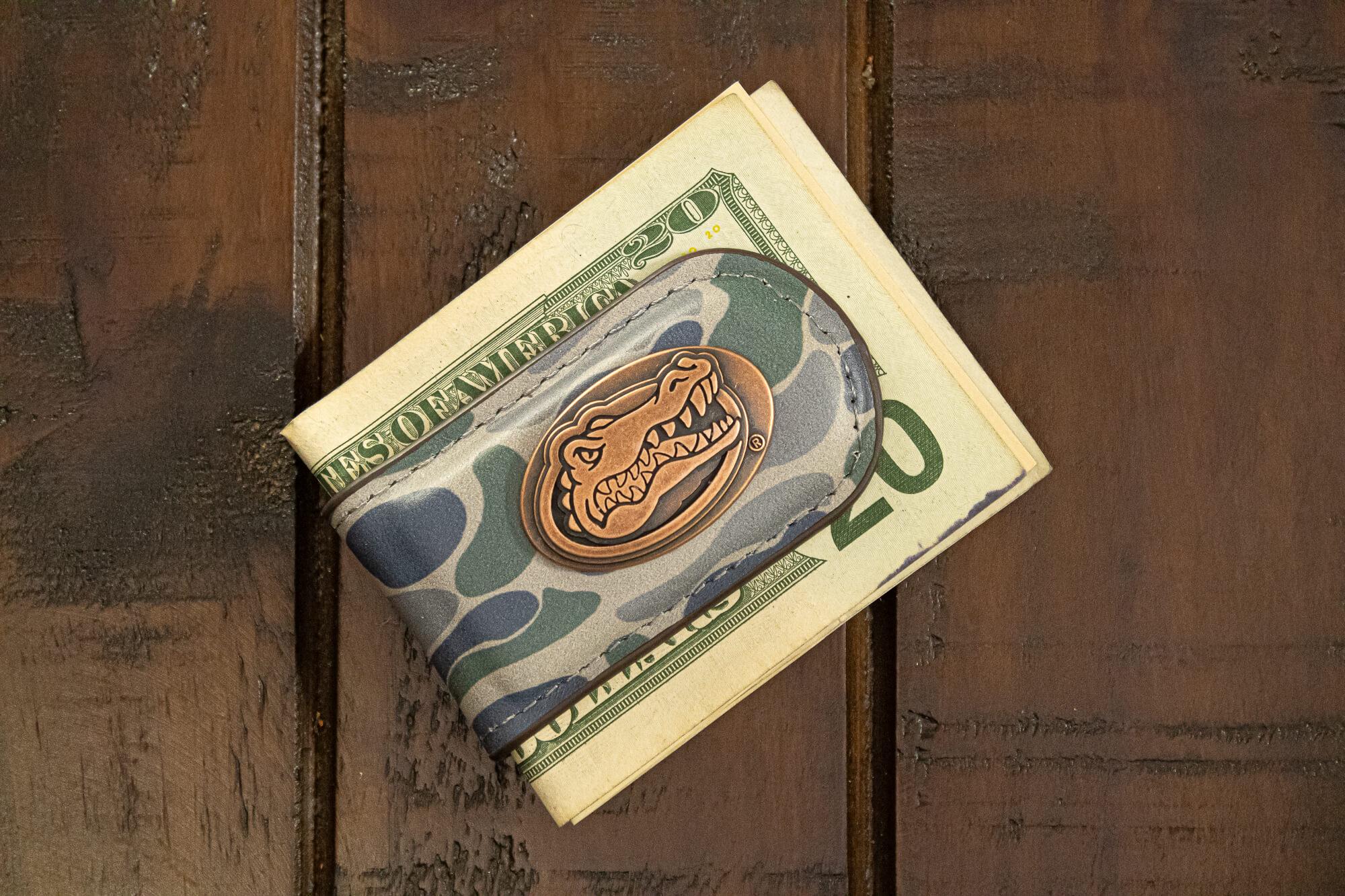 Show your Florida Gators pride with an original Zep-Pro Old School Camo leather money clip. It is a stylish and unique way to show enthusiasm while keeping important cards and cash organized. This Zep-Pro wallet is constructed of full grain leather with an Old School Camo print. The metal concho emblem has an antique copper finish which perfectly accents this unique accessory.
