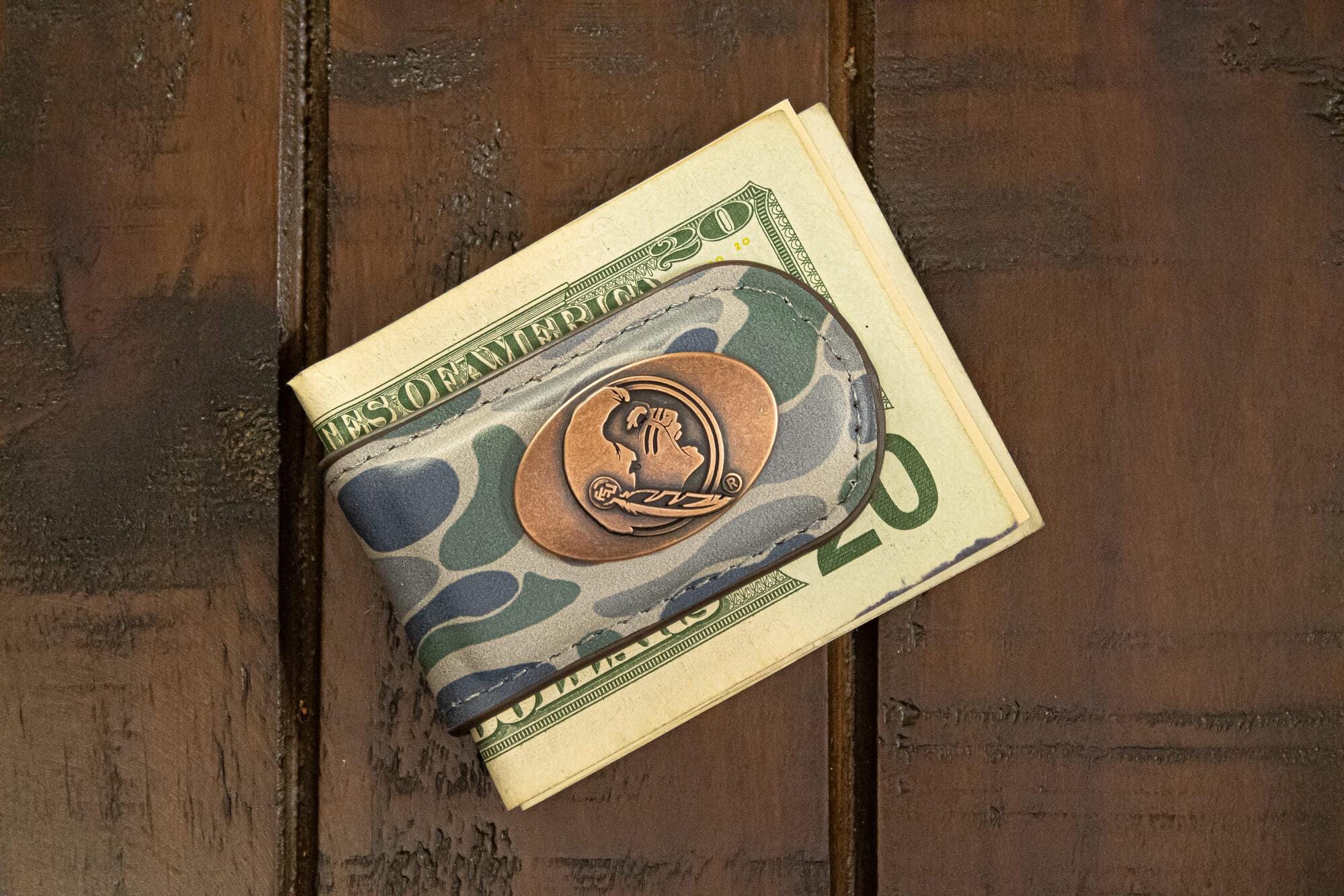 Show your FSU Seminoles Tigers pride with an original Zep-Pro Old School Camo leather money clip. It is a stylish and unique way to show enthusiasm while keeping important cards and cash organized. This Zep-Pro wallet is constructed of full grain leather with an Old School Camo print. The metal concho emblem has an antique copper finish which perfectly accents this unique accessory.