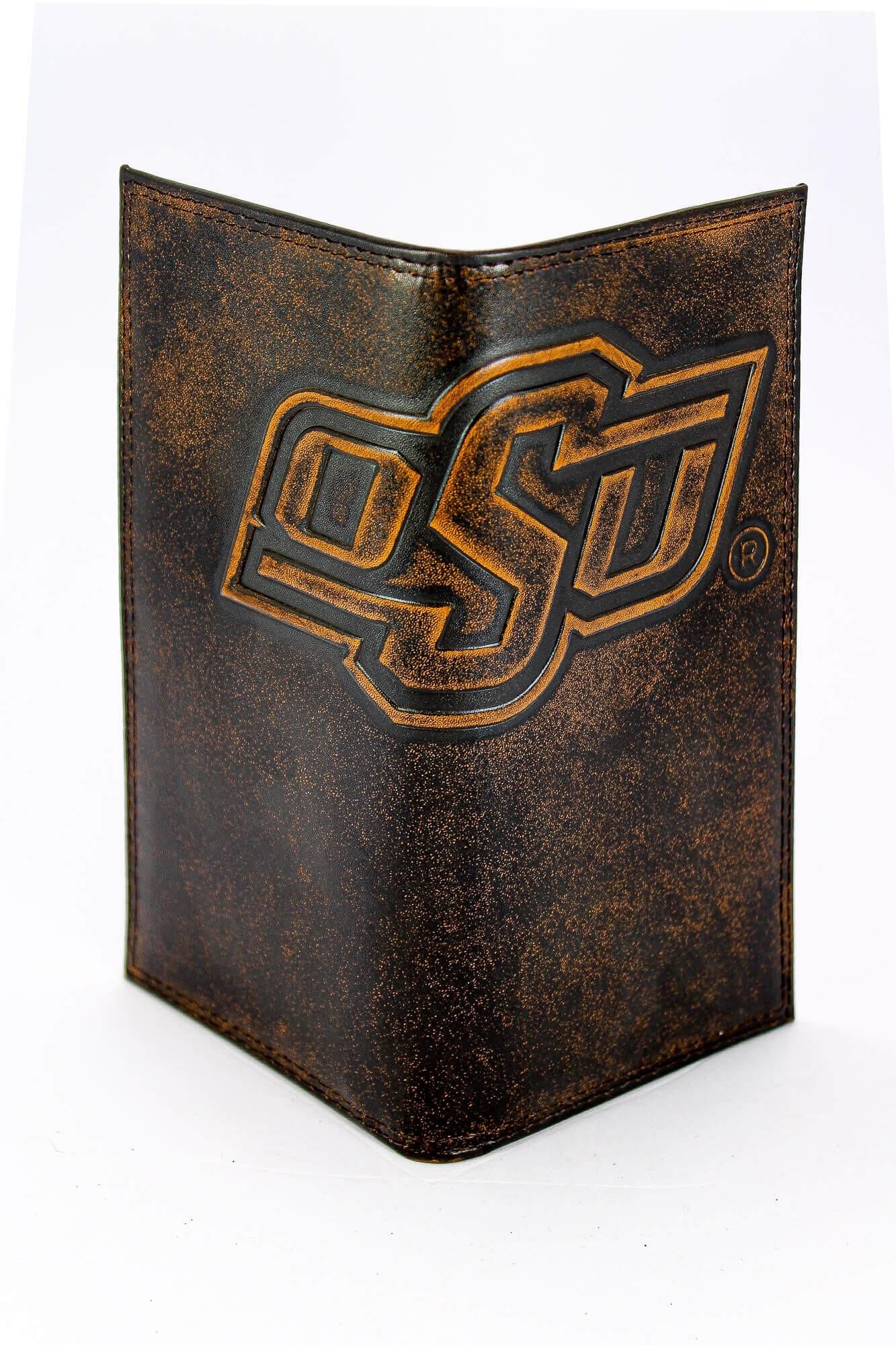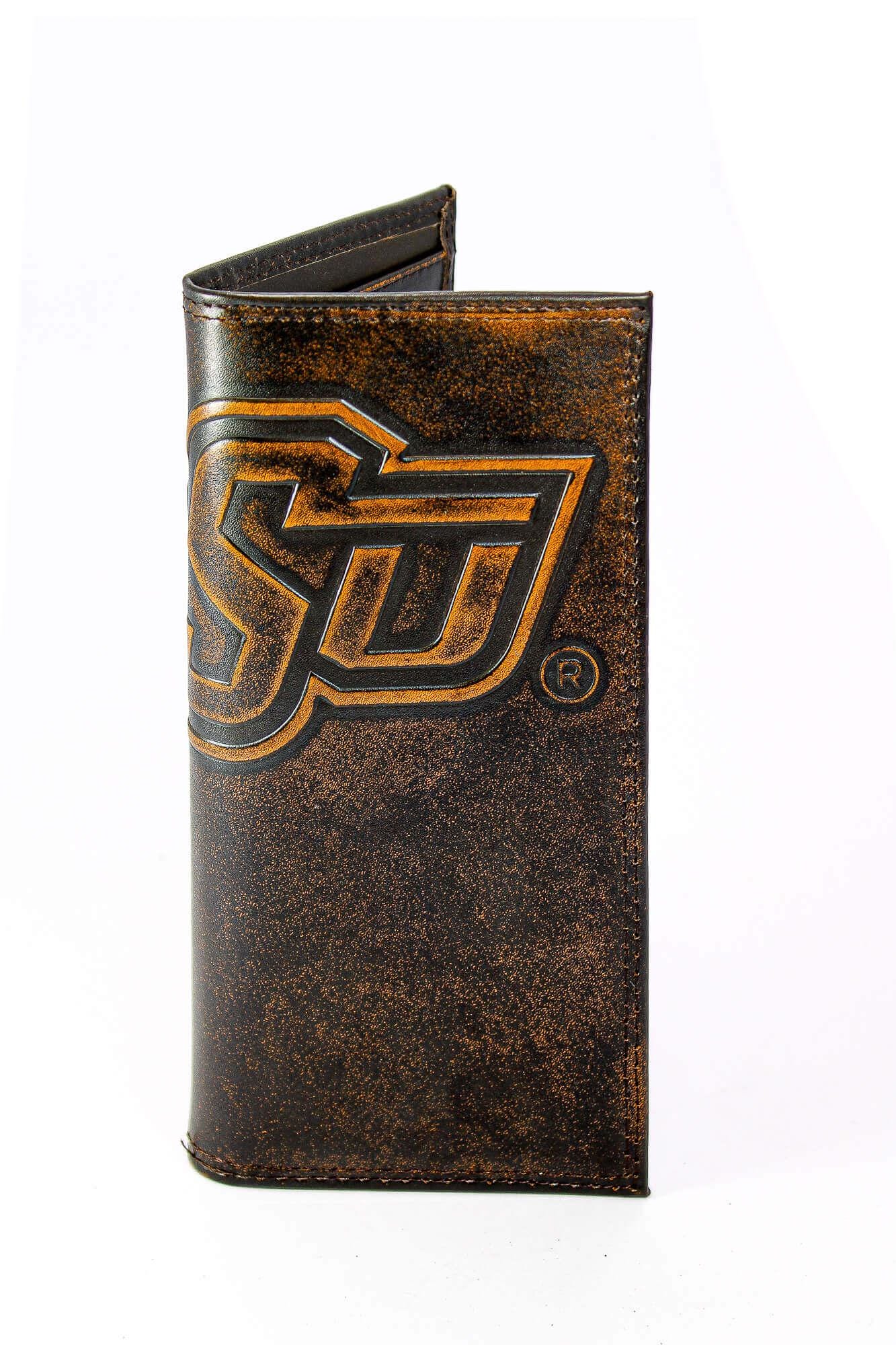Show your OSU Cowboys pride with an original Zep-Pro collegiate leather secretary tall wallet. This accessory is popular among college students and alumni. It is a stylish and unique way to show enthusiasm while keeping important cards and cash organized. This Zep-Pro wallet is constructed of full grain leather with a hand burnished finish and features the school’s official logo, proudly displayed on the overlapping sides. The design and placement of the large logo is intended to appear partially on the front and back.