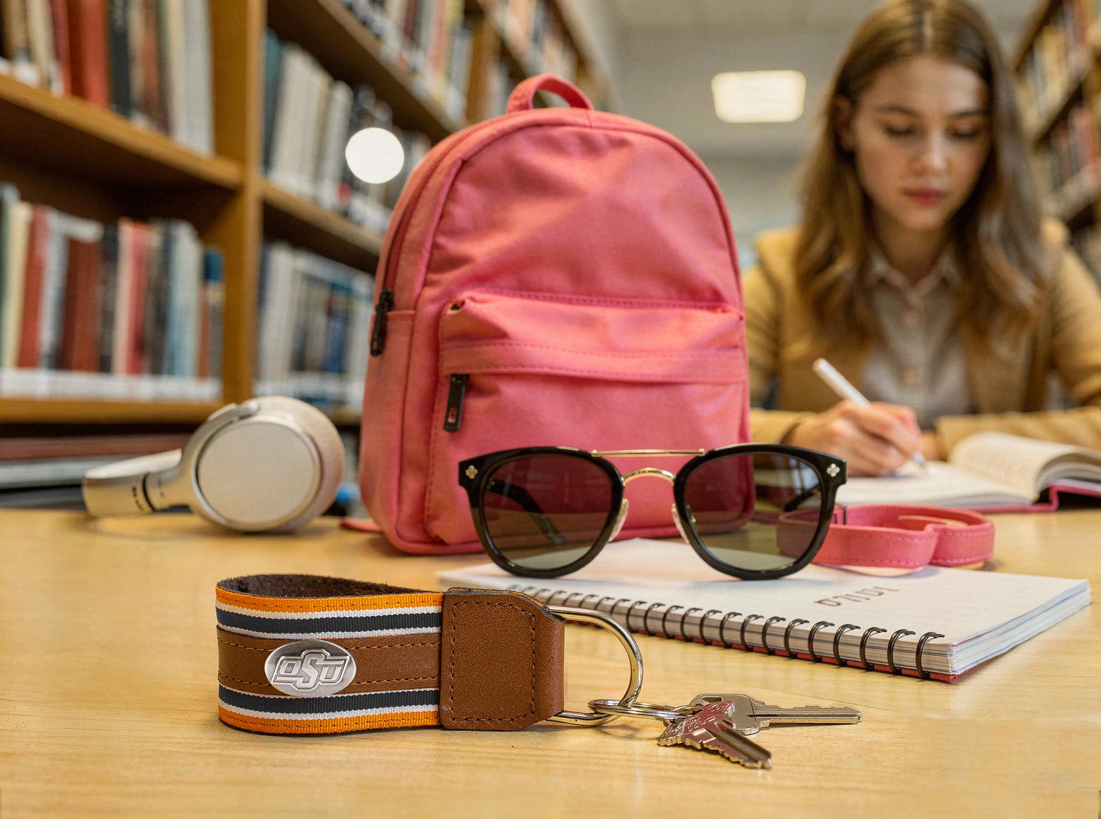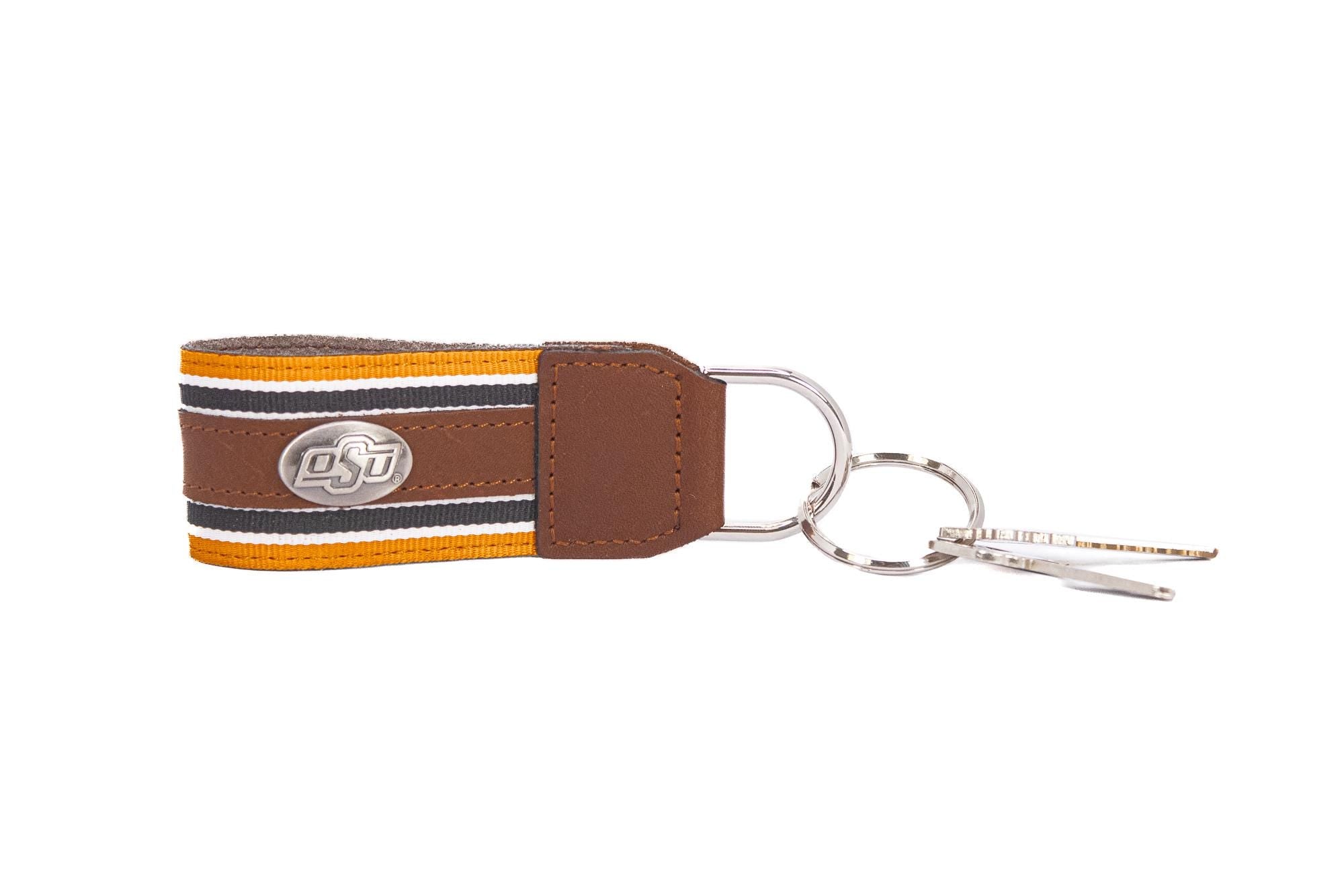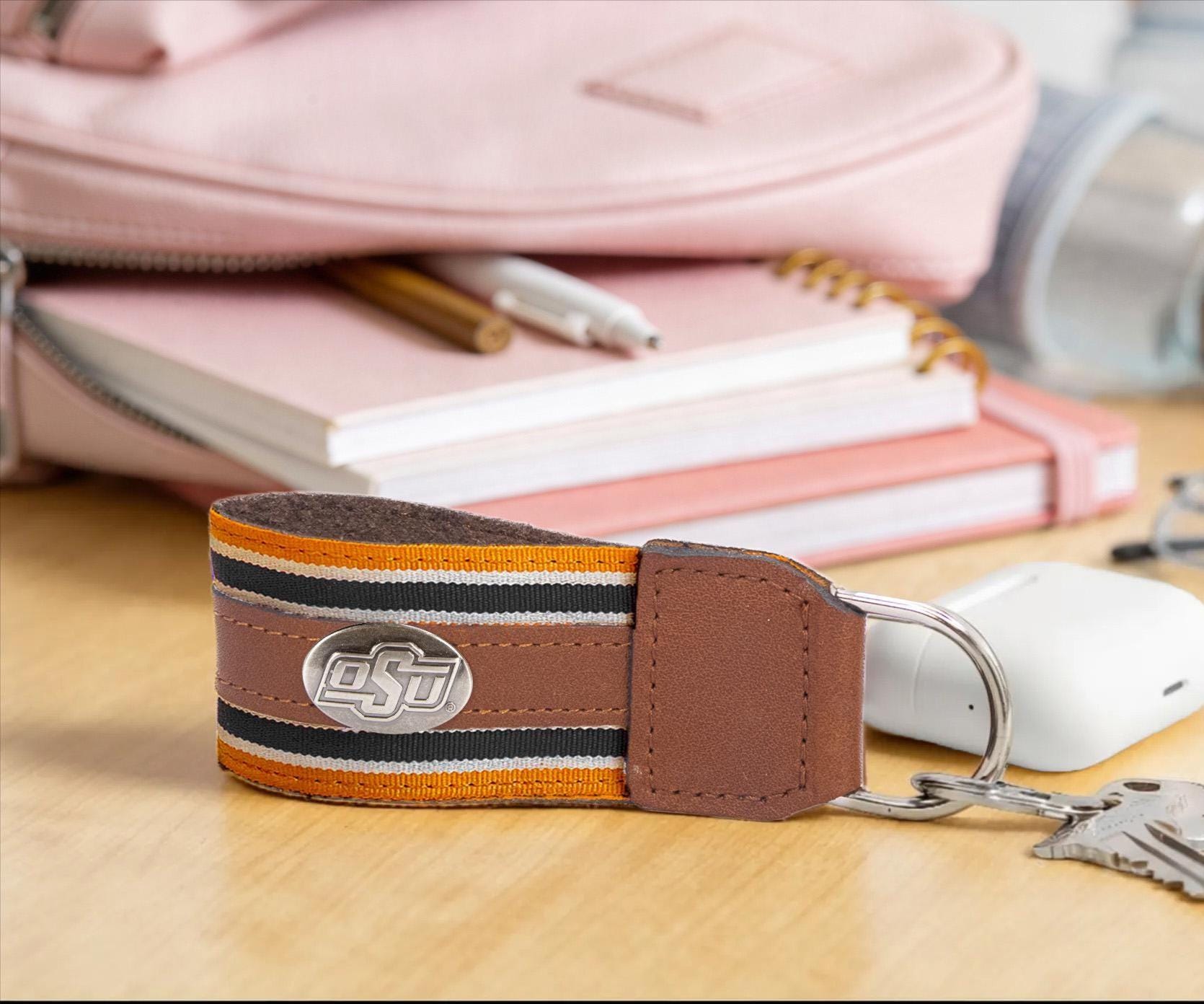 Show your OSU Cowboys pride with this officially licensed grosgrain ribbon key chain. Designed with a bold striped ribbon pattern and accented with rich brown leather, this key fob delivers a classic, timeless look that pairs effortlessly with everyday accessories. The silver-tone emblem is prominently displayed on the front, adding a distinctive finishing touch that represents true team spirit.