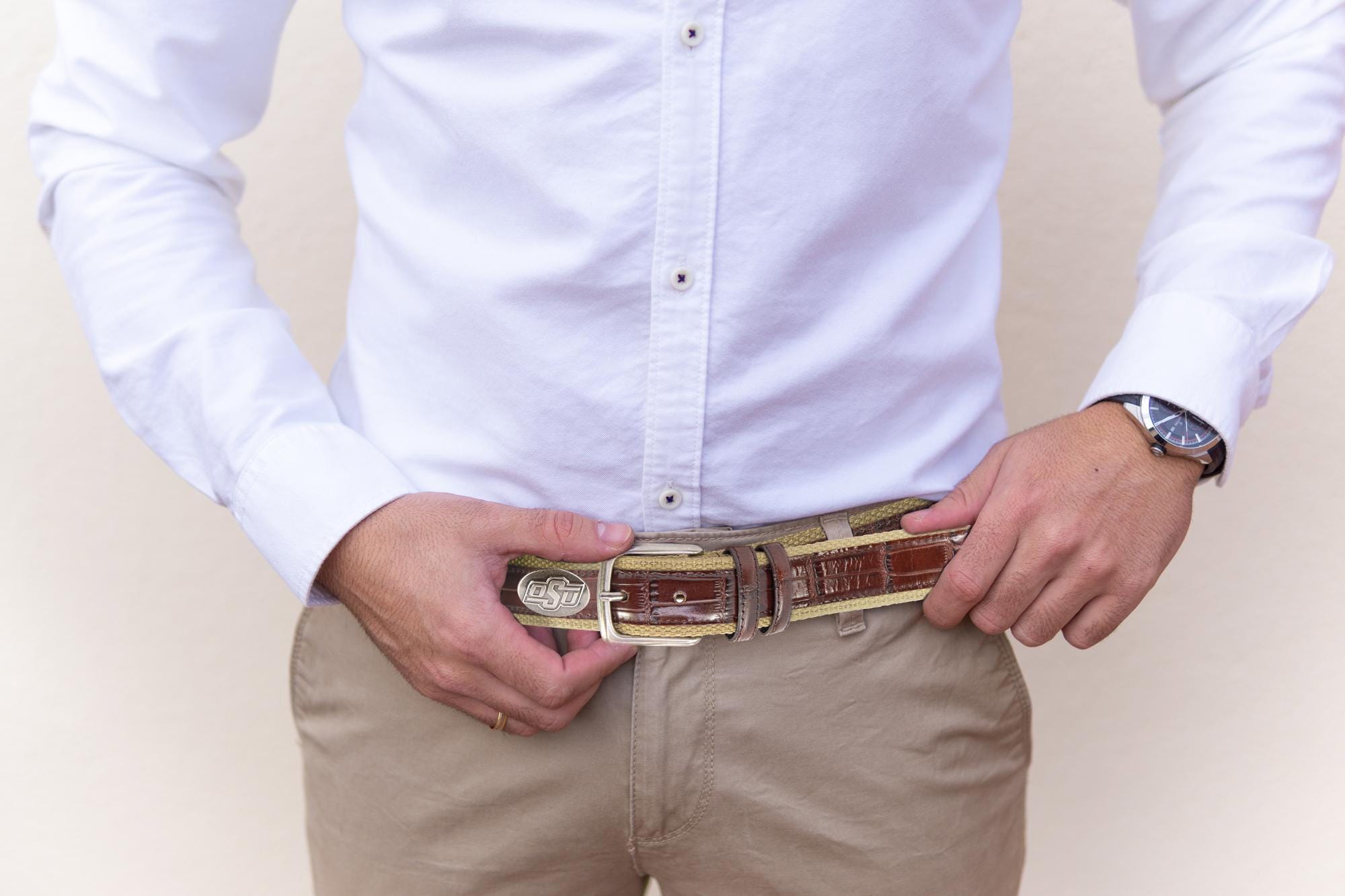 Oklahoma State Cowboys Khaki Webbed Belt With Croc Leather Inlay | Collegiate Casual Game Day Belt Oklahoma State Cowboys Khaki Webbed Belt With Croc Leather Inlay | Collegiate Casual Game Day Belt