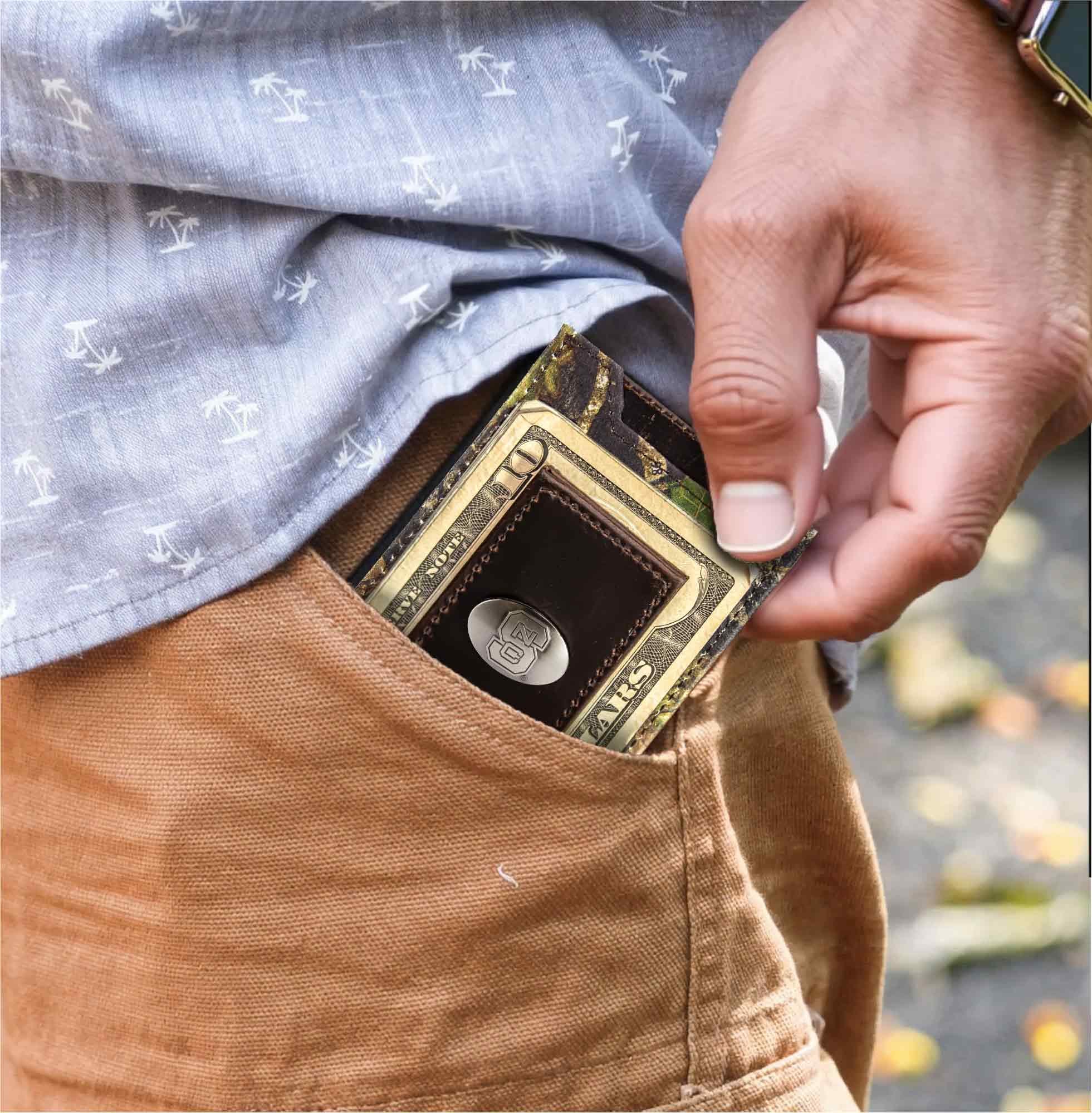Show your NC State Wolfpack pride with an original Zep-Pro Mossy Oak Camo leather wallet. Select from four different popular body styles: bifold, trifold, tall secretary, slim magnetic front pocket. These wallets are popular among outdoor enthusiasts who love sporting their favorite college team. It is a stylish and unique way to show enthusiasm while keeping important cards and cash organized. This Zep-Pro wallet is constructed of full grain leather and durable nylon print, featuring the school’s official logo, proudly displayed on the front upper right corner. The metal concho emblem has a silver finish which perfectly accents this unique wallet.